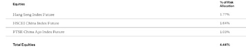 今年表现最好的权益类资产却下注较低,风险配置不足5%,主要投入恒生股指期货和富时中国A50股指期货。