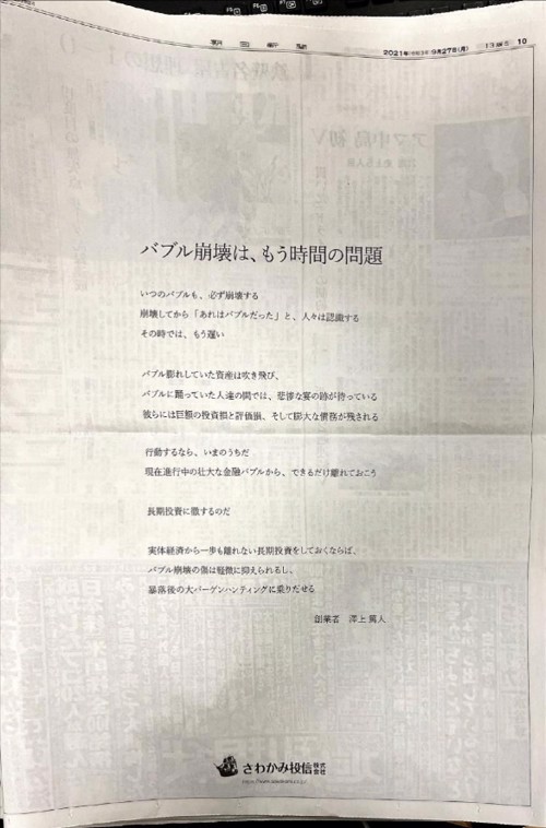 在《朝日新闻》其中一版广告中,他表示,“泡沫经济破灭,只是时间问题。”。