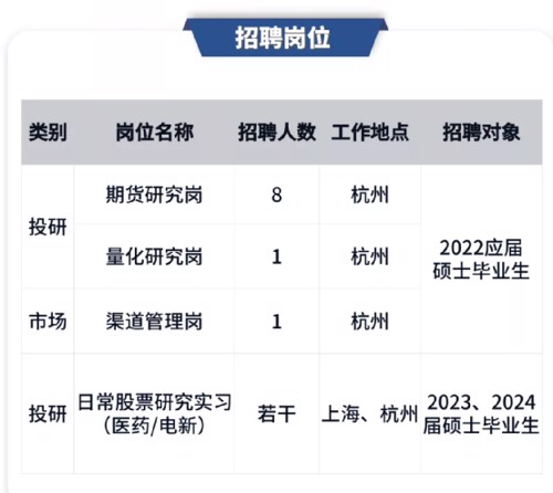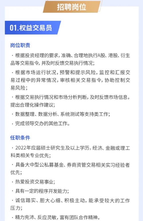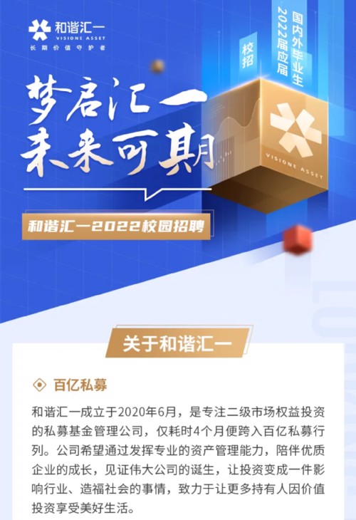 9月18日,新锐百亿私募和谐汇一也发布了2022校园招聘,岗位包括权益交易员、营销策划经理等,要求应届硕士研究生及以上学历。