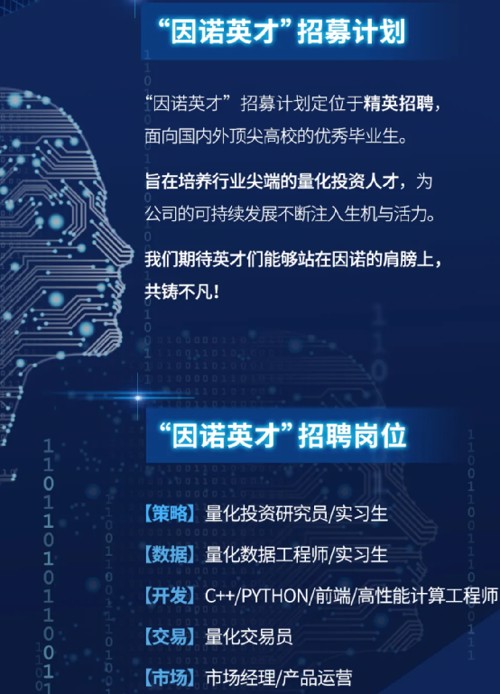 9月18日,新晋百亿私募因诺资产也抛出“因诺英才”招募计划,招聘量化投资研究员/实习生、量化数据工程师/实习生、C++/PYTHON/前端/高性能计算工程师、量化交易员、市场经理/产品运营。