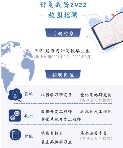 年轻的百亿量化私募衍复投资的校园招聘显示,面向2021年9月到2022年9月毕业的海内外高校毕业生,招聘岗位包括策略方面,机器学习研究员、量化策略研究员;技术方面,包括数据开发工程师、运维开发工程师、量化系统开发工程师;职能方面,销售支持岗、基金运营专员、雇主品牌实习生等。