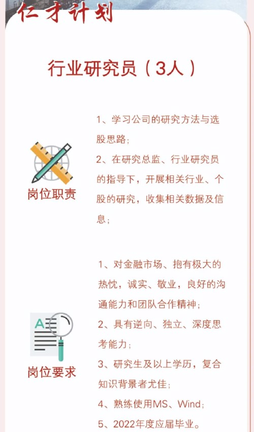 仁桥资产也在最近发布了2022校园招聘计划,招聘岗位包括行业研究员3人,学历也要去研究生及以上,尤其看好复合知识背景者;岗位职责方面要求学习公司的研究方法与选股思路,在研究总监、行业研究员的指导下,开展相关行业、个股的研究,收集相关数据及信息。