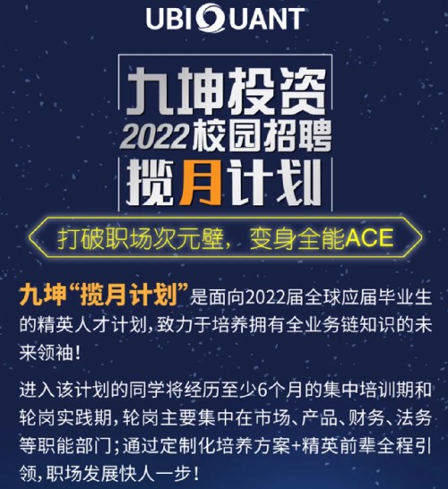9月初,量化私募巨头九坤投资也发布2022年校园招聘“揽月计划”,致力于培养拥有全业务链知识的未来领袖。九坤投资称,进入该计划的人才将经历至少6个月的集中培训期和轮岗实践期,轮岗主要集中在市场、产品、财务、法务等职能部门,制定培养方案,精英前辈全程引领。