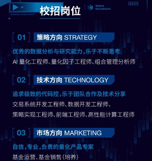 校招岗位包括:(1)策略方向,AI量化工程师、量化因子工程师、组合管理分析师,需要优秀的数据分析与研究能力;(2)技术方向,交易系统开发工程师、数据开发工程师、策略实现工程师、前端工程师、高性能计算工程师,追求极致的代码控;(3)市场方向,基金运营、基金销售(培养)。