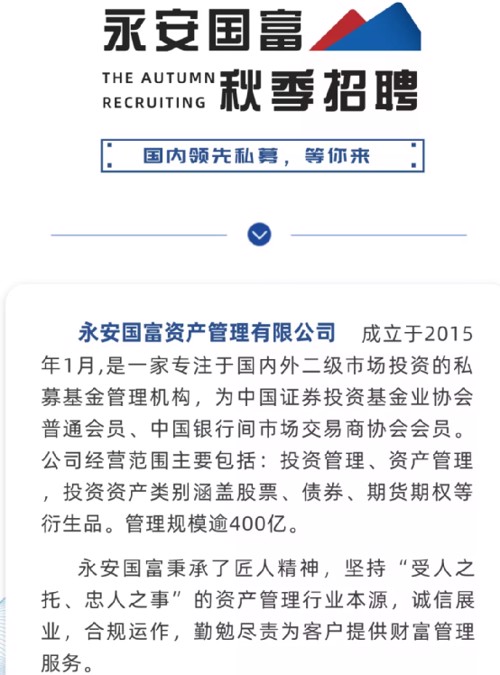 之前,百亿私募永安国富也发布了秋季招聘,招聘岗位包括期货研究岗、量化研究岗、日常股票研究实习、渠道管理岗、资深客户经理、JAVA开发岗。据了解,永安国富成立于2015年,投资资产类别涵盖股票、债券、期货期权等,管理规模超过400亿。