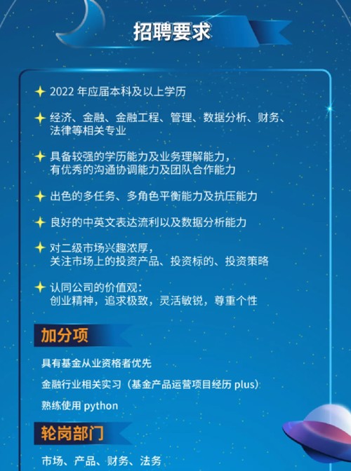 在招聘要求方面,包括经济、金融、金融工程、管理、数据分析、财务、法律等相关专业;还要求良好的中英文表达流利以及数据分析能力;希望对二级市场兴趣浓厚,关注市场上的投资产品、投资标的、投资策略。另外,加分项包括具有基金从业资格者优先,金融行业相关实习(基金产品运营项目经历plus),熟练使用python。