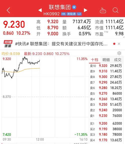 申请科创板上市的联想集团,今天上午在港股市场暴涨10.27%,公司市值1100亿港元。