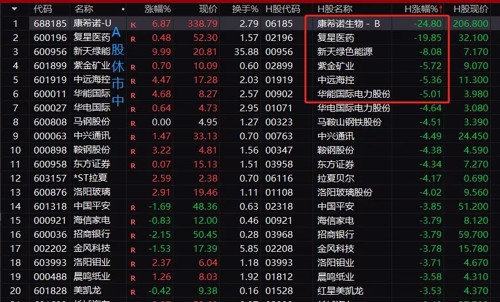 同时AH上市的股票,H股对A股影响最为直接,今天上午,康希诺、复星医药、新天绿色能源、紫金矿业、中远海控、华能国际电力等H股跌幅超5%。
