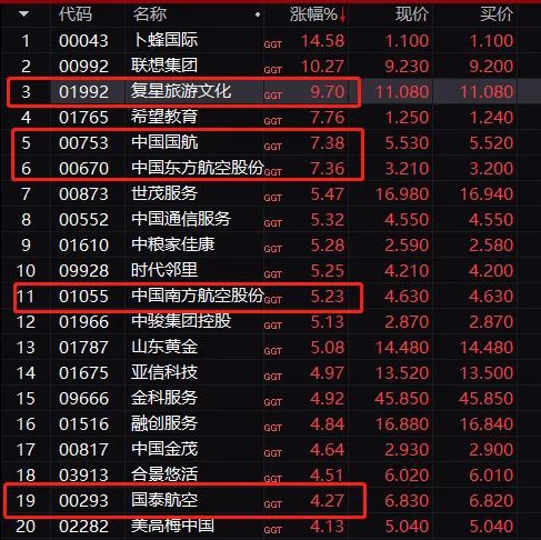 复星旅游文化大涨近10%,中国国航、中国东方航空涨超7%。南方航空、国泰航空等也大涨。而物业股也大涨。