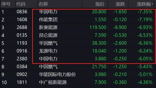 近期电力供应紧张,电力股狂涨。不过今日上午港股电力股燃气股大跌。华润电力跌超7%,龙源电力、中国电力跌超6%;新奥能源、华润燃气等也跌超6%。消息面上,国家能源局推动电网接入公平开放。