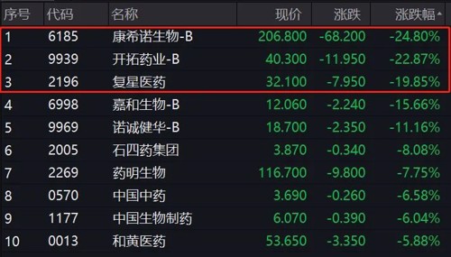 上午,康希诺生物、开拓药业、复星医药等港股疫苗股暴跌,康希诺暴跌25%,,复星医药暴跌20%,开拓医药也跌超20%,嘉和生物、诺诚健华跌超10%。重磅医药股,药明生物、中国生物制药等也大跌。