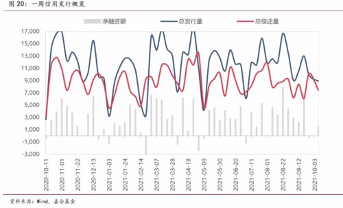 上周(9.27-10.8)一级市场信用债发行量 8,918.72 亿元,总偿还量 7,446.24 亿元,净融资量 1,472.48 亿元。分评级来看,上周高评级 AAA 发行占比为 54.12%,AA+发行占比为 14.88%。从期限结构来看,1 年内发行金额占比 59.00%,中长期限发行占比有所减少。本周共有 19 只债 券推迟或取消发行,合计金额为 164.90 亿元,本周取消发行数量和金额较上周均略有所增加。