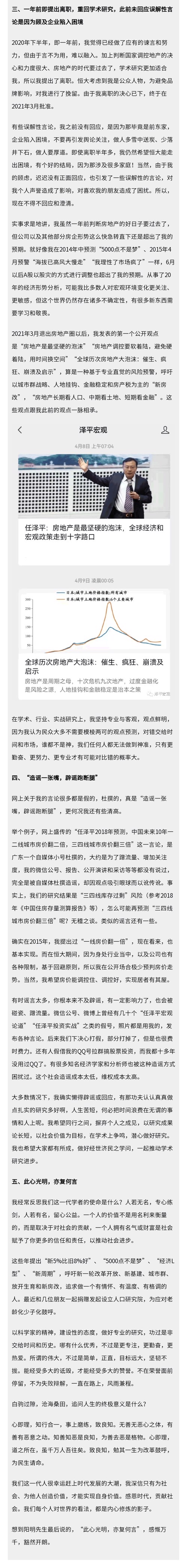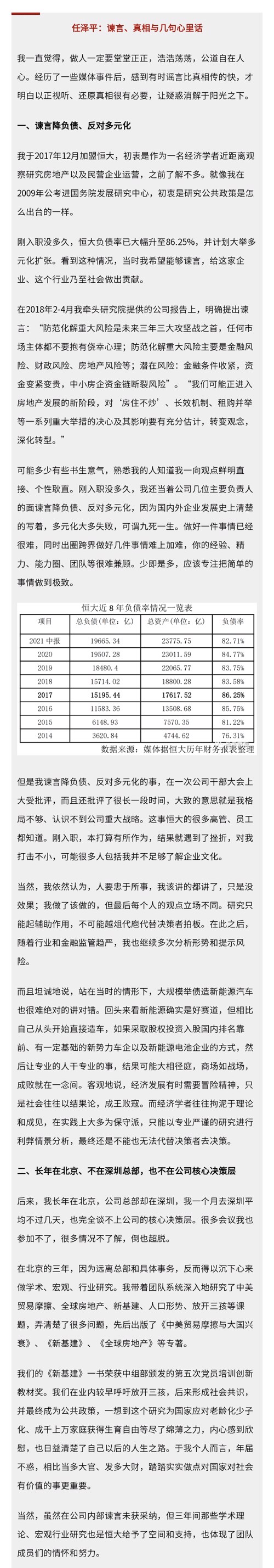 而之前没有回应市场的误解性言论,任泽平称是因为是前东家,企业陷入困境,不要再引发舆论关注,做人多雪中送炭、少落井下石,做人要厚道。即使离职半年多,仍然希望恒大能走出困境,有个好的结局