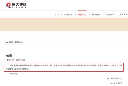 10月9日,恒大集团在官网公布对6名提前赎回恒大财富投资产品管理人员处罚进展。恒大集团表示,6名提前赎回恒大财富投资产品的管理人员,已于10月8日前将所有提前赎回的款项全额归还到恒大财富指定账户。该公司已对上述6名管理人员进行问责惩处。