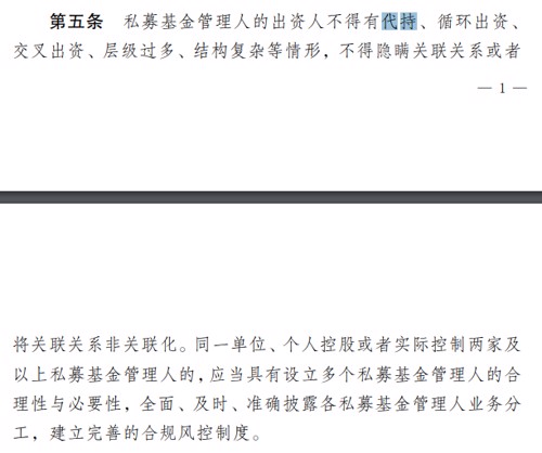 在今年年初证监会发布的《关于加强私募投资基金监管的若干规定》中提到,私募基金管理人的出资人不得有代持、循环出资、交叉出资、层级过多、结构复杂等情形,不得隐瞒关联关系或者将关联关系非关联化!