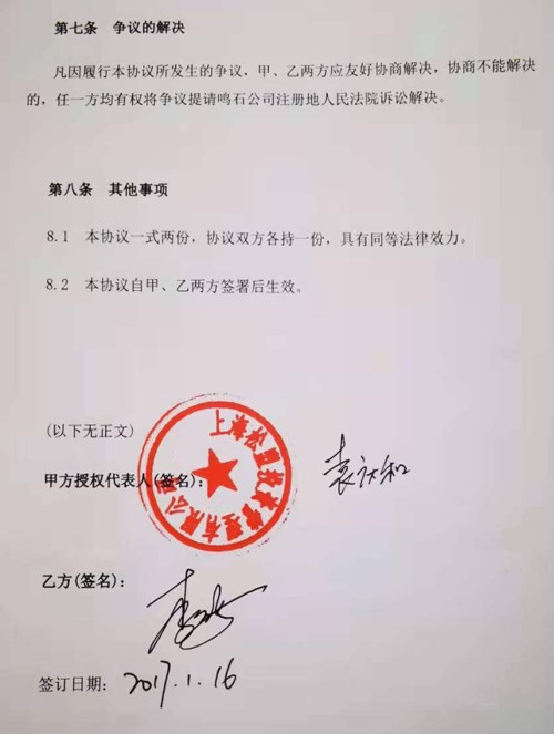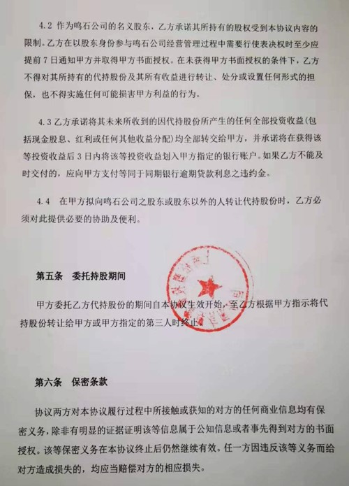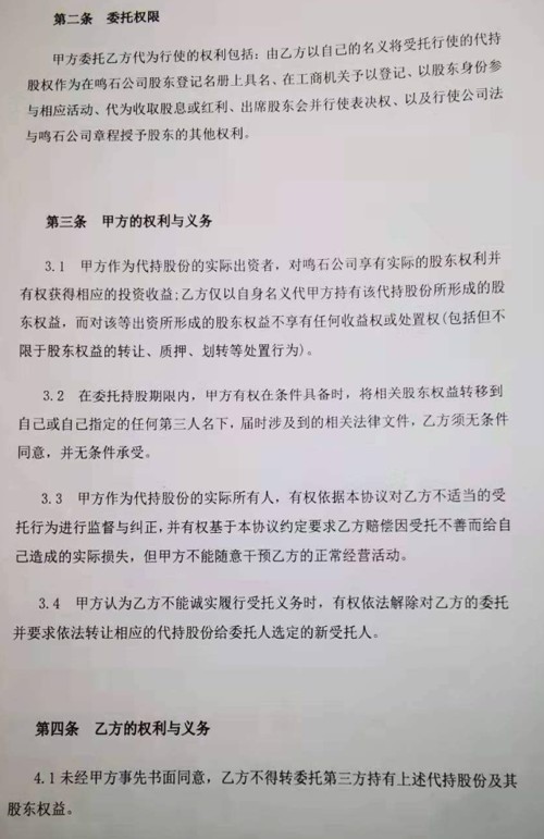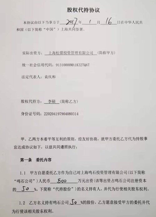 袁宇表示,他是鸣石的实际控制人,其控制的上海松盟投资管理有限公司(下称“松盟”),持有鸣石50%及35%共计85%股权。而李硕名下的全部鸣石50%股权,均为松盟委托其代持,李硕并非鸣石的股东。昨日,松盟已正式函告李硕,解除委托代持关系,收回鸣石的50%股权。