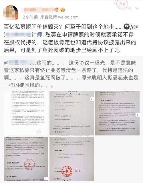 有业内人士在微博分析,意味着这家私募只有终止业务等清盘一条路了,还有评论称,私募在申请牌照的时候就要承诺不存在股权代持的,这老板肯定也知道代持协议披露出来的后果,可是到了鱼死网破的地步已经顾不上了吧