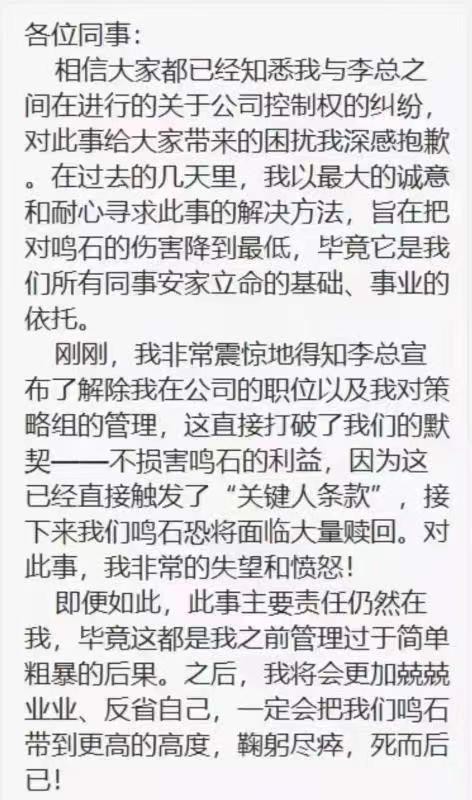 晚间17点40多分,鸣石投资在其公众号发布说明公告称,公司自成立以来一直由持股超50%的单一大股东李硕控制,股权结构稳定清晰,从未发生过变化,公司各项投资决策和管理制度健全。