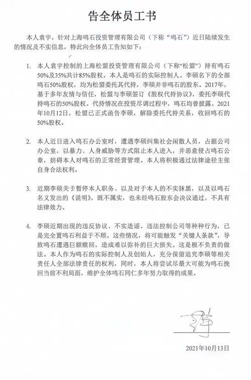 13日一大早,鸣石投资创始人袁宇写给公司同事的一封信,引发市场关注。