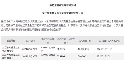 据易方达基金近日发布的《关于旗下基金重大关联交易事项的公告》,9月29日,“顶流基金经理”张坤在管的易方达优质企业三年持有买入招商银行1630万股,买入均价为51.05元,买入金额合计约8.32亿元。