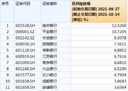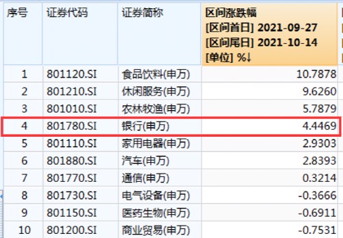自9月27日重启上涨行情以来,截至10月14日收盘,合计9个交易日中,申万银行指数有6天上涨,期间累计涨幅达4.45%,在28个申万一级行业中排名第四,也是在震荡中为数不多录得正涨幅的板块之一。