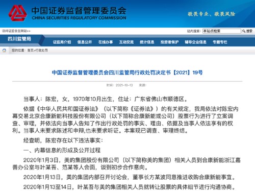 身家千万也未能抵挡金钱的诱惑。近日,中国证监会四川监管局公布的一则行政处罚决定书显示,市值达5000亿的美的集团原副总裁妻子陈宏在内幕信息敏感期,使用堂姐的证券账户内幕交易合康新能,赚了不到11万,被罚80万元。