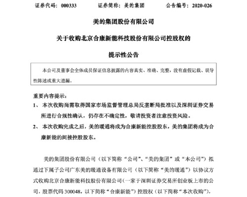 3月25日收市后,美的集团发布了《关于收购北京合康新能科技股份有限公司控股股权的提示性公告》,合康新能发布了《关于公司控股股东、实际控制人拟发生变更的提示性公告》。