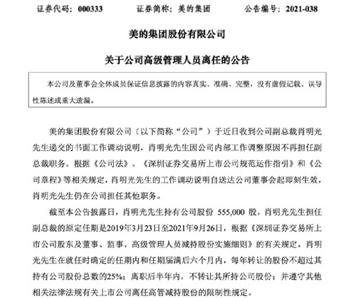 2021年4月30日,美的集团发布公告称,公司于近日收到副总裁肖明光递交的书面工作调动说明,肖明光因公司内部工作调整原因不再担任副总裁职务。根据相关规定,肖明光的工作调动说明自送达公司董事会起即刻生效,肖明光仍在公司担任其他职务。