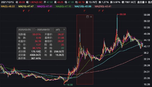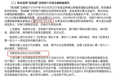 内幕信息敏感期内,陈宏于2020年3月25日14:35分开始通过电脑委托下单,分3笔共计买入15万股合康新能的股票,成交金额50.3万元。2020年6月2日至3日,该账户将15万股合康新能股票全部卖出,数据显示,期间合康新能股价累计涨超33%,陈宏盈利10.57万元。