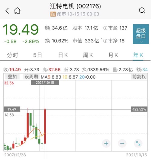 截至10月15日,今年以来,江特电机股价累计大涨超420%。