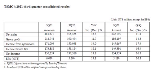 据证券时报报道,台积电10月14日下午公布了三季度业绩。三季报显示,台积电营收4146.71亿新台币(约合951亿人民币),市场预期4135.6亿新台币,去年同期3564.26亿新台币;净利润1563亿新台币(约合358亿人民币),市场预期1494.73亿新台币,去年同期1373.1亿新台币;这意味着,公司每天净赚近4亿元人民币。