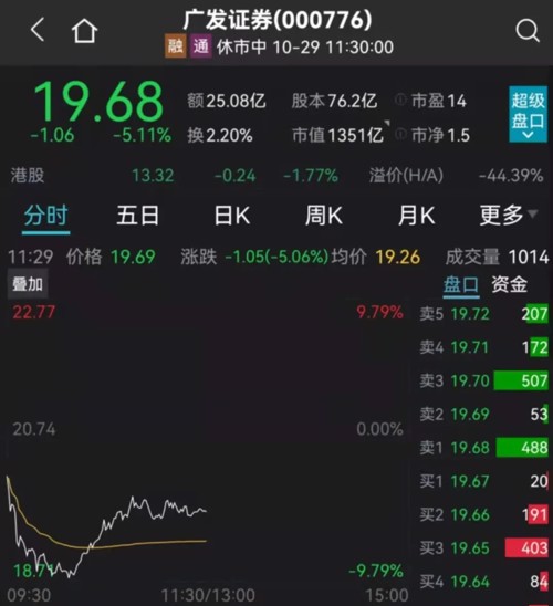 除此之外,广发证券也逼近跌停,截至午间收盘,跌幅收窄至5.11%。