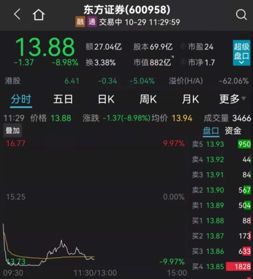 东方证券低开低走,开盘不到5分钟,就触及跌停板,总市值跌出千亿俱乐部。截至午间收盘,仍然下跌近9%。