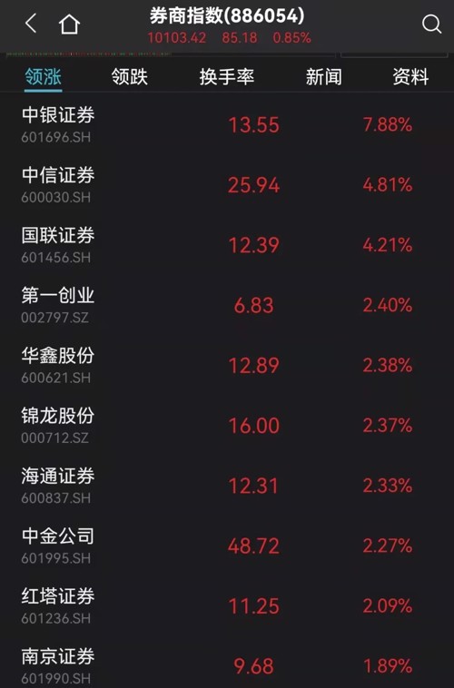 截至午间收盘,中银证券涨近8%,中信证券涨近5%,国联证券业涨超4%。