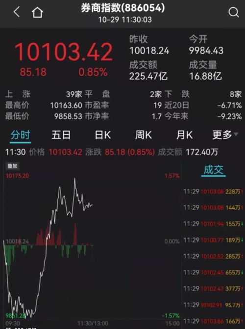 29日早盘,券商指数整体低迷,临近午盘突然拉升,走出V型反转。