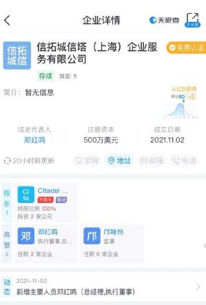 天眼查信息,信拓城信塔(上海)的法定代表人为邓红鸣,公司由城堡旗下的Citadel Asia Limited(城堡亚洲有限公司)100%控股。注册资本为500万美元。