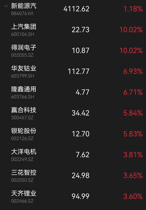此外,整个新能源汽车板块涨幅靠前。得润电子、华友钴业等涨幅居前。