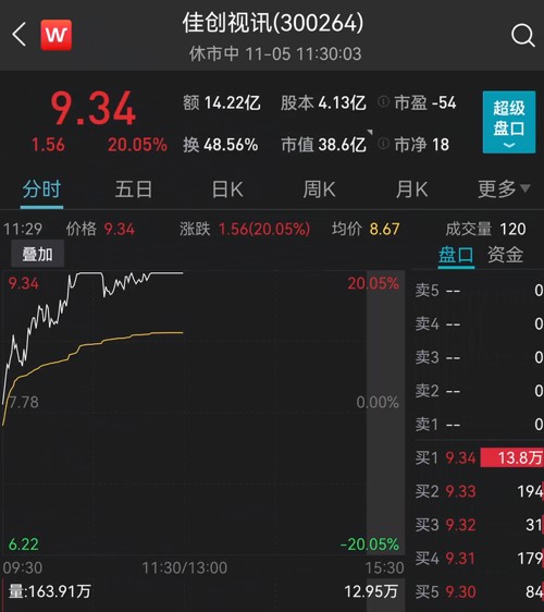 佳创视讯再次20%涨停,连录得3个涨停板。