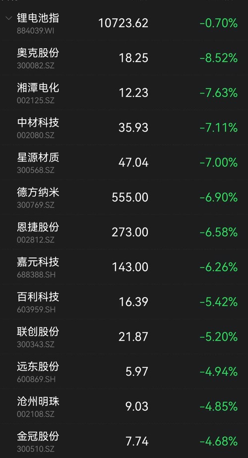 整个锂电池板块跌幅较大,星源材质、德方纳米、奥克股份、百利科技、湘潭电化、中材科技大幅下滑。