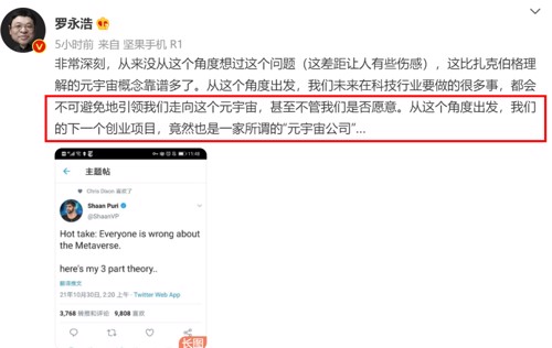 11月5日,罗永浩发博称:“我们的下一个创业项目是一家所谓的‘元宇宙公司”。