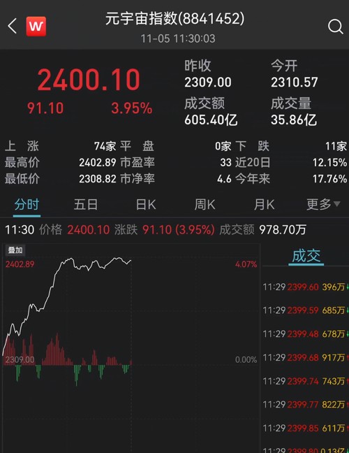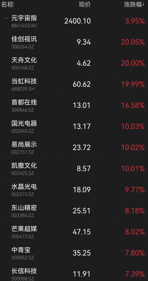 今天,A股元宇宙板块强势依旧,指数早盘一路走高,收涨近4%。