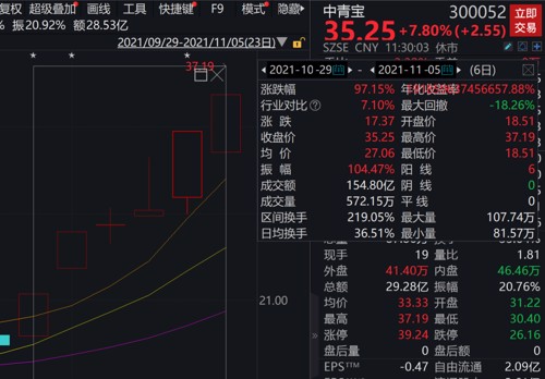 中青宝更是收涨7.8%,6日内股价已从18元狂飙至如今35.25元,股价一度翻倍。