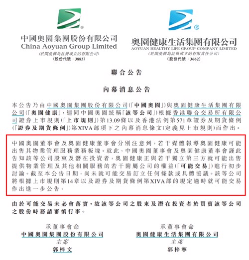 11月4日,中国奥园和奥园健康联合公告,中国奥园董事会及奥园健康董事会告知该公司股东及潜在投资者,奥园健康正与若干独立第三方就可能出售提供物业管理及其他相关服务的若干附属公司的权益(可能交易)进行初步讨论。截至该公告日期,尚未就可能交易订立任何条款或具体协议。