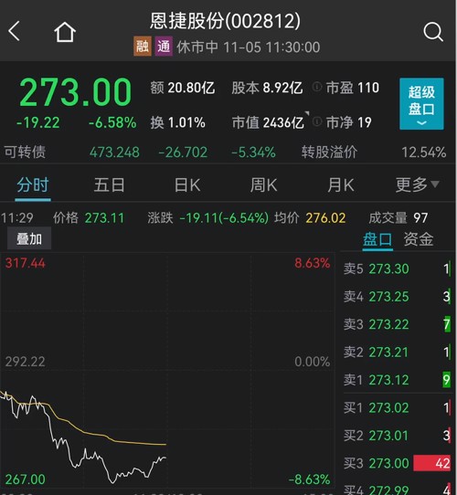 恩捷股份开盘放量跌近8%,截至午间收盘,收跌6.58%,最新股价273元,市值2436亿元。