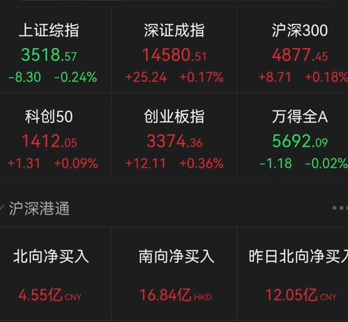 上证指数午盘跌0.24%,创业板指涨0.36%,万得全A跌0.02%,北向资金净买入超4亿元。