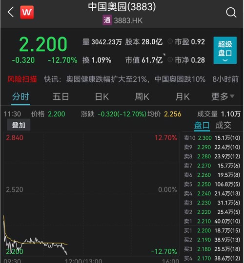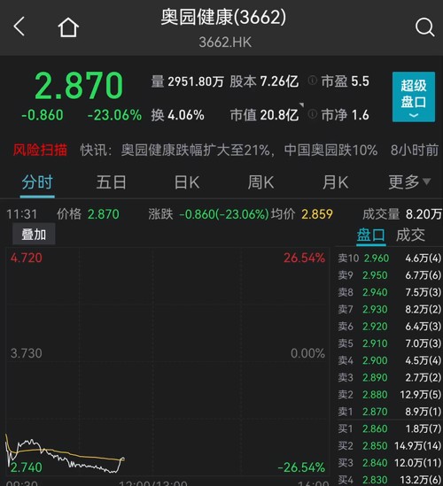 今天早盘,中国奥园开盘直崩超10%,截至记者发稿,跌幅扩大至12%,奥园健康一度跌超26%,截至记者发稿,仍跌超23%。