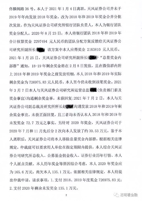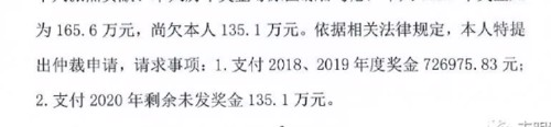 2、而2020年的奖金,天风只给了廖志明30多万,廖志明认为,一整年的奖金算下来应该是165万多,也就是还有135万元没发完。