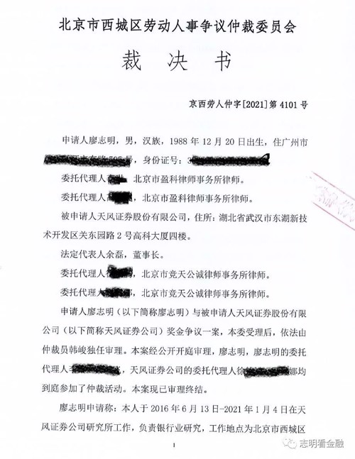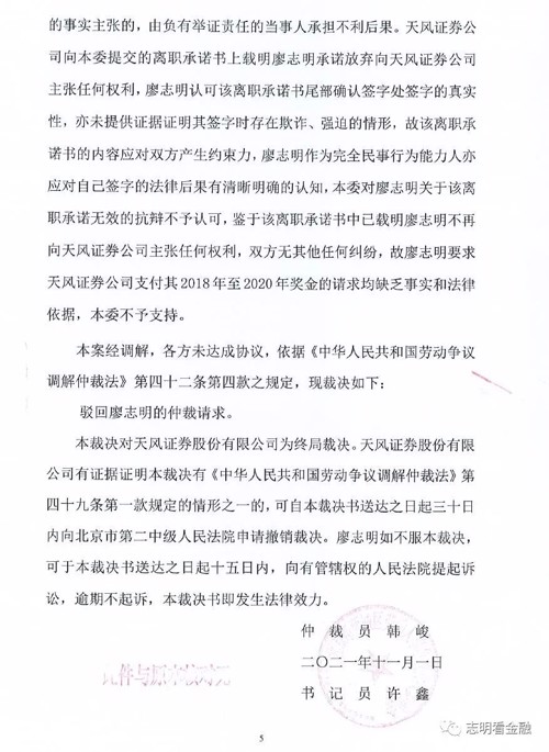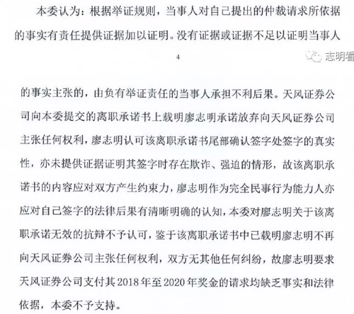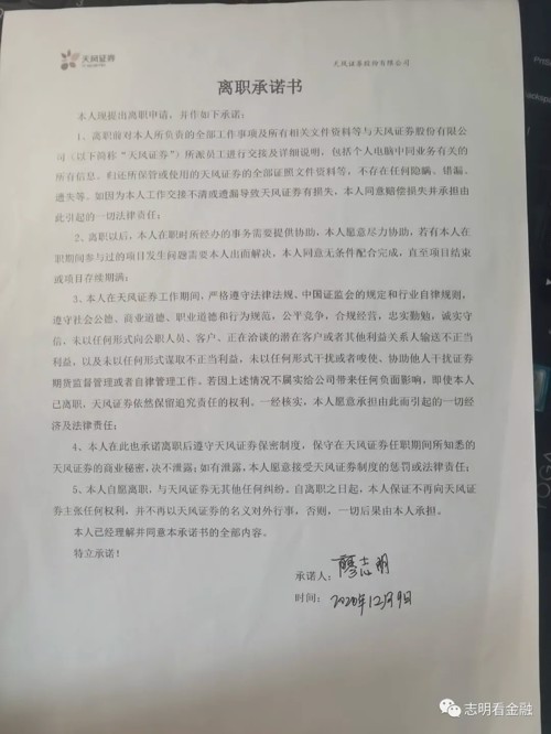 7、2021年10月13日上午,仲裁案件正式开庭,因为廖志明离职前签过一份承诺书,里面显示,离职之日,本人保证不再向天风证券主张任何权利。