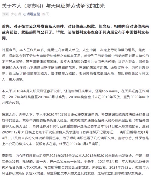招商证券的银行首席分析师廖志明,这两天在网上发文声讨前东家天风证券,原因很简单,就是钱的问题,廖志明称,在天风勤勤恳恳工作了四年多,结果离职后,2018年和2019年剩余未发奖金都不给,微信也被删了!