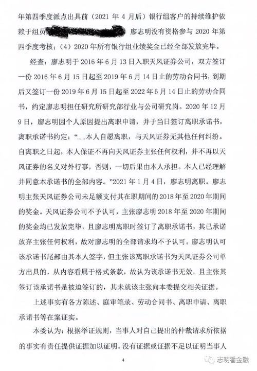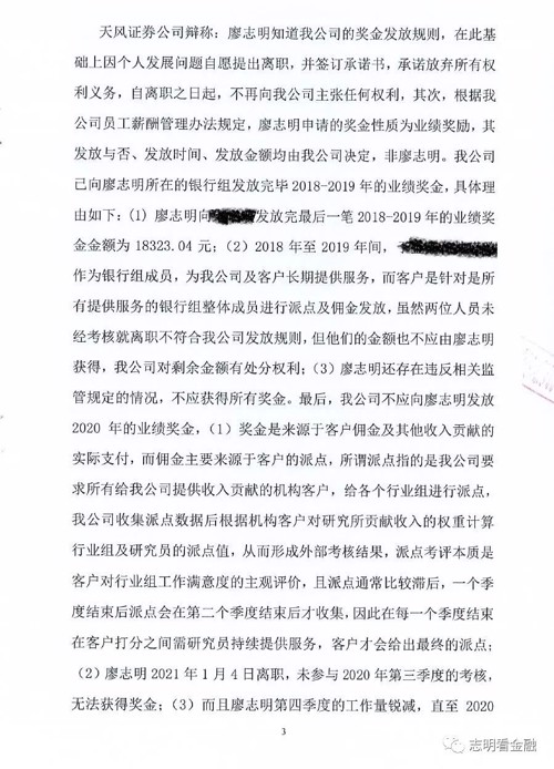 4、天风证券这边认为,第一、廖志明离职的时候就承诺不向公司主张任何权利;第二、2018、2019两年,因为有银行组的分析师没经考核就离职,本来属于他们的奖金也不能算到廖志明的身上;第三、廖志明没有参与2020第三季度的考核,而且四季度工作量明显锐减,客户派点是其他同事在做,因此也没资格参与2020四季度的考核。